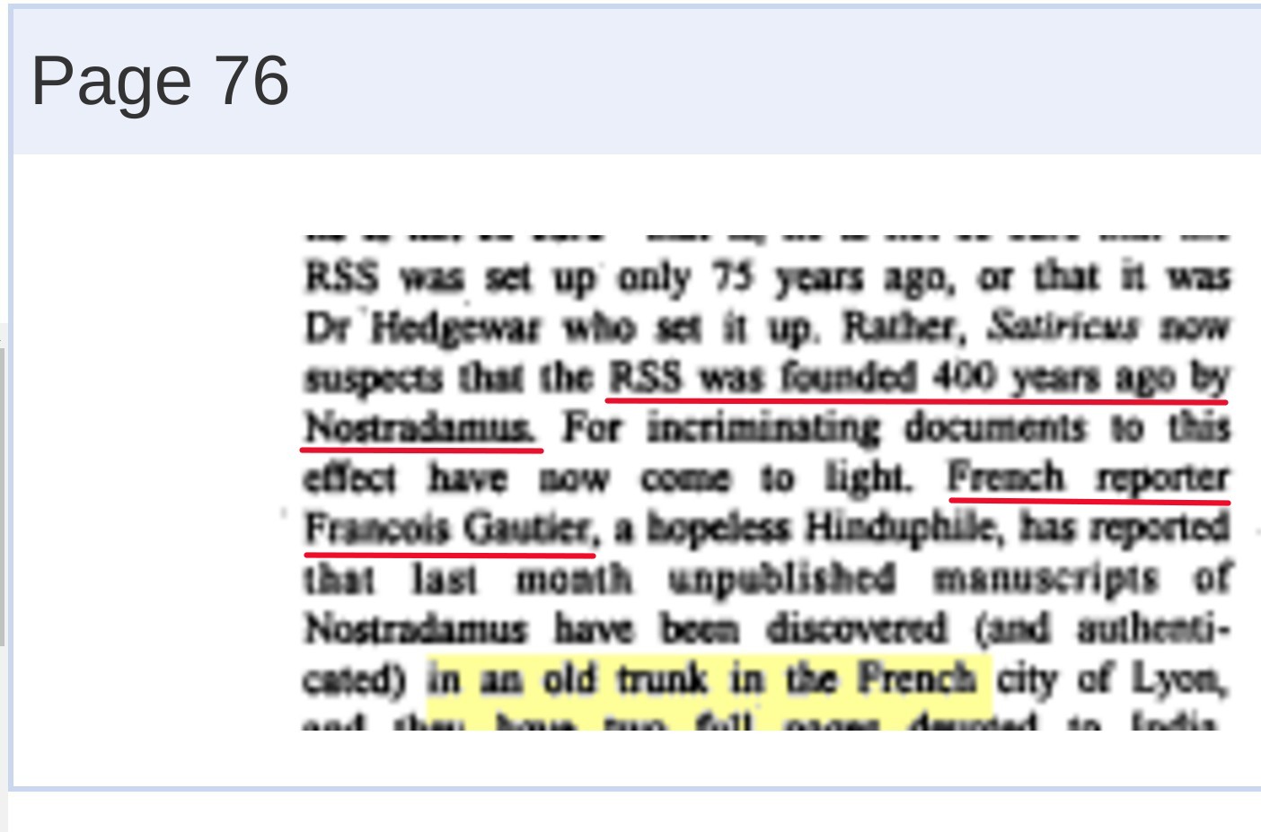 So, in 2012, some Nostradamus specialist discovered an old trunk that had these magical pronouncements. The only problem with this claim is that in the 51st volume of RSS weekly magazine Organiser published in 1999, it has been claimed that “an old trunk” was discovered just last month by “hopeless hinduphile Francois Gautier” and according to the manuscripts, it was Nostradamus who had founded RSS 400 years ago.