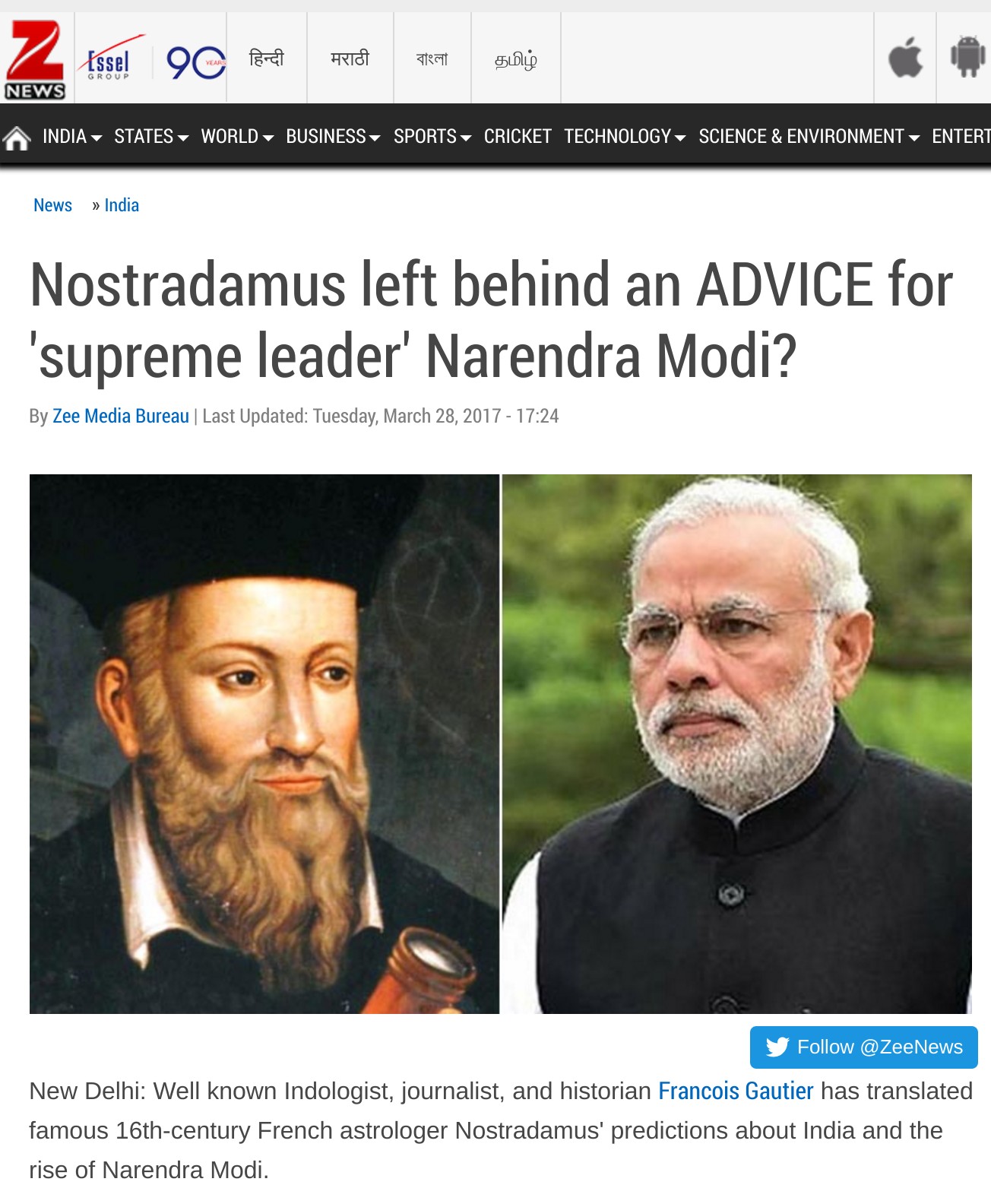 So, from Murli Manohar Joshi as the pillar in 2009 to Narendra Modi as the pillar in 2014 to Narendra Modi as the supreme leader of India in 2017, Gautier has been conveniently changing the prophecies that come out of that “old trunk” based on the prevailing political climate. Yet, such blatant lies are given space in Indian media outlets without any verification. After the TOI blog, Zee News dutifully published this bit of ‘news’.