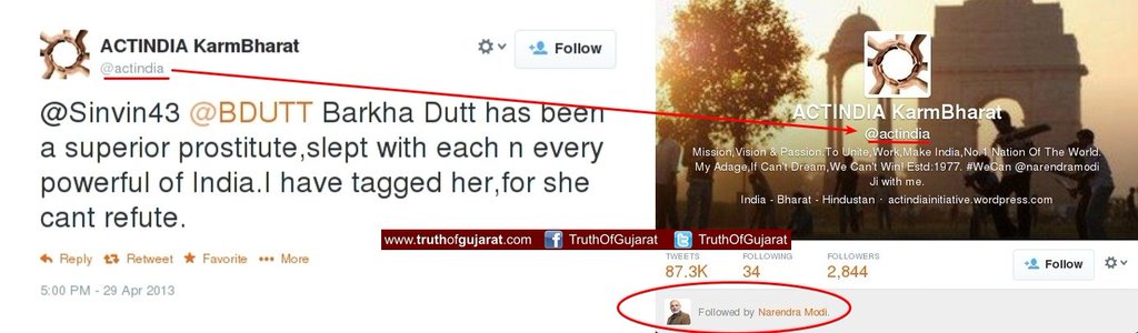 The screenshot above is a heinous message which is targeting Barkha Dutta and the user proudly declared that he’s tagging her, while the message below is against Aaj Tak anchor Anjana Om Kashyap. What is the common factor? Followed by PM Modi on Twitter.