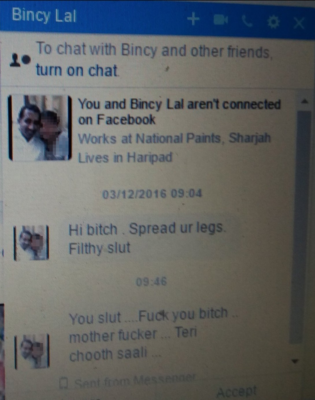The 31-year-old employee identified as Bincylal Balachandran, from Kerala, joined Alpha Paint in Dubai, a sister company of National Paints in Sharjah, in 2015. He worked as a customer service employee. Balachandran sent an abusive message with sexual overtones to the Indian journalist on Facebook messenger.