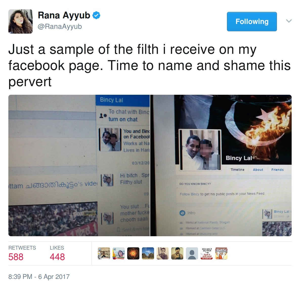Ayyub posted a screenshot of the message on April 6 saying: “Just a sample of the filth I receive on my Facebook page. Time to name and shame this pervert.”