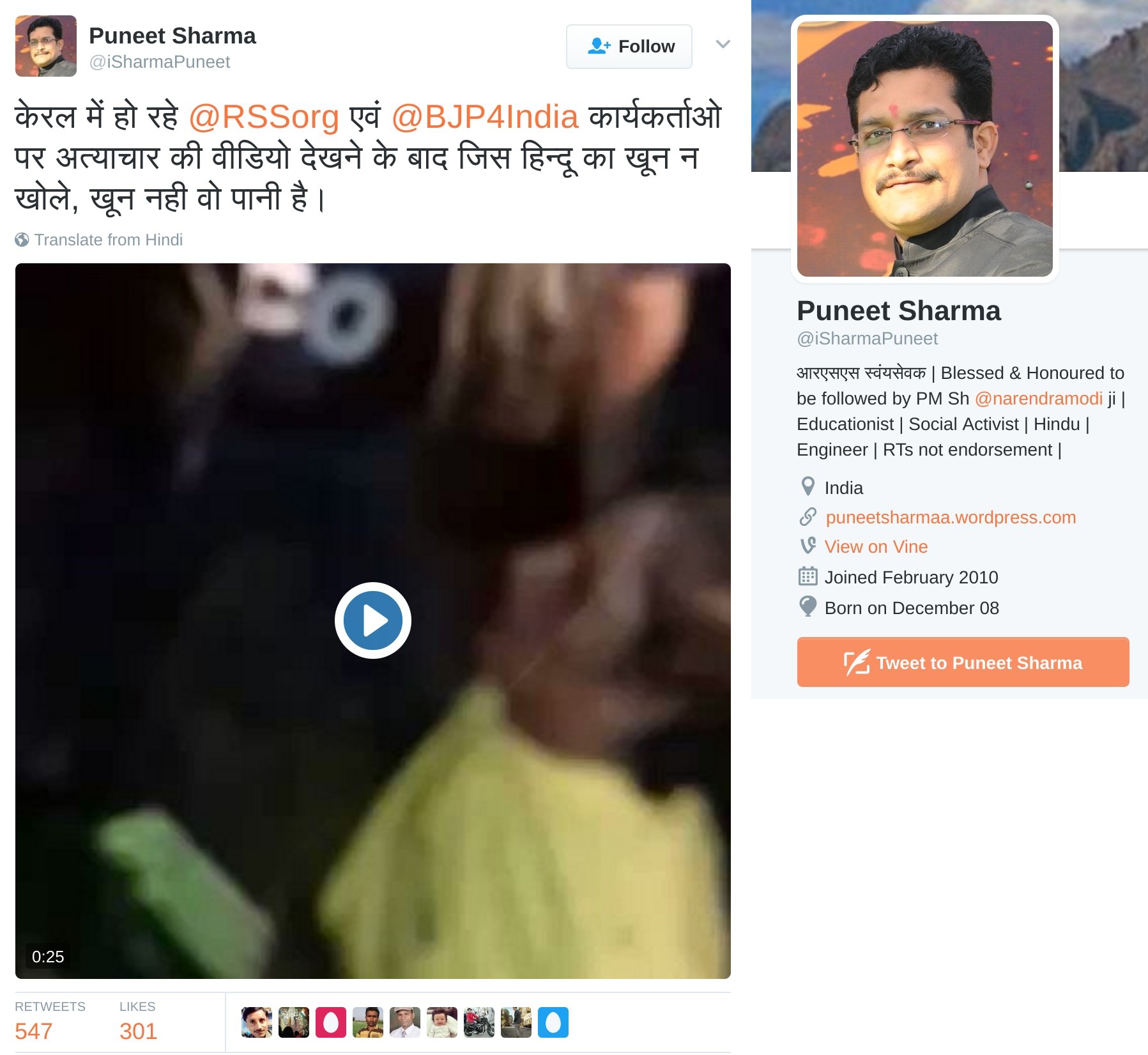 Puneet Sharma, who is followed by PM Modi on Twitter, posted a video of one person being tied up and stabbed repeatedly. In this video that he posted at 3:47 PM on 3rd March 2017, Puneet claimed that the video is that of a RSS member getting killed in Kerala. Considering that he has over 31.8k followers on Twitter, the video got massively retweeted. He wrote “केरल में हो रहे @RSSorg एवं @BJP4India कार्यकर्ताओ पर अत्याचार की वीडियो देखने के बाद जिस हिन्दू का खून न खोले, खून नही वो पानी है।” (After watching this video of torture on RSS Karyakarta in Kerala, those Hindu whose blood doesn’t boil, their blood is not blood but water). The link to the video is at the bottom of the post.