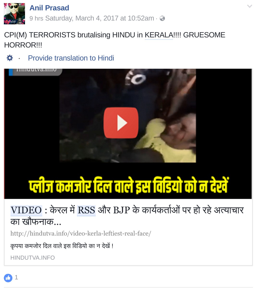 Puneet Sharma’s twitter video was embedded in a blog post by a site called ‘hindutva.info‘ with a title “VIDEO : केरल में RSS और BJP के कार्यकर्ताओं पर हो रहे अत्याचार का खौफनाक मंजर!” (A horrifying instance of the torture on RSS/BJP workers in Kerala). This post, in turn, has been shared close to 10k times on different social media networks.