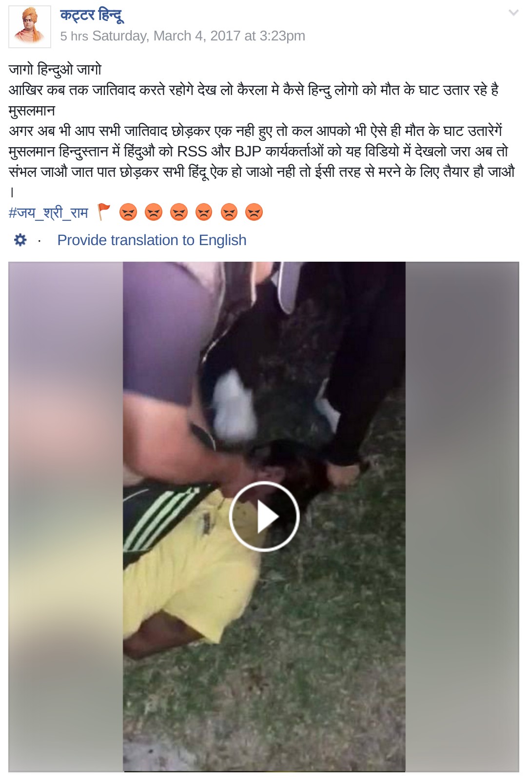 The video was uploaded multiple times on various social media platforms including Facebook, Twitter and WhatsApp with thousands and thousands of shares. Others in the Hindutva brigade gave it a further spin and claimed that it is Muslims murdering RSS/BJP members in Kerala and there’s a need to give up casteism to fight this evil. For eg, the following Facebook account called “Kattar Hindu” wrote: