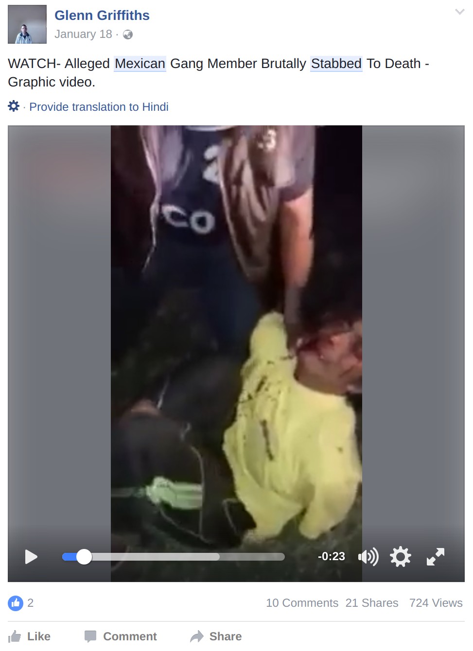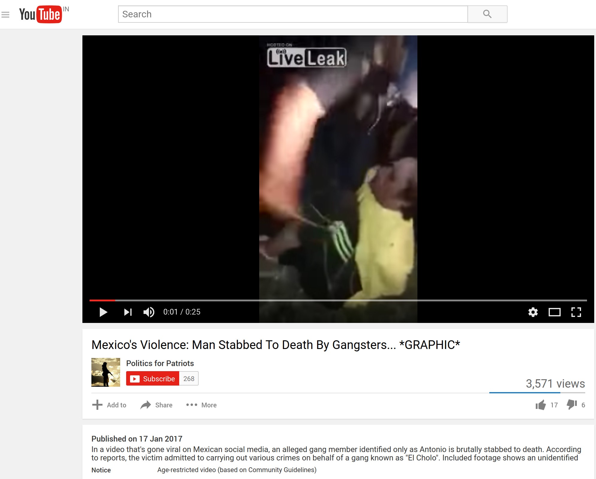 According to reports, the victim admitted to carrying out various crimes on behalf of a gang known as “El Cholo”.Included footage shows an unidentified man repeatedly stabbing the victim to death.This video went viral on January 15, 2017, out of an unidentified location in Mexico.