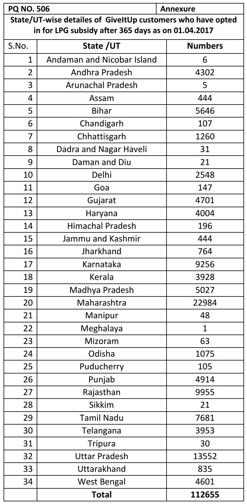 It can be seen from the data provided by Ministry of Oil and Natural Gas that more than one lakh people have opted back for LPG subsidy 1 year after having opted out with the highest number of people opting back from Maharashtra.
