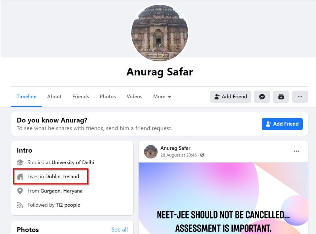 A Facebook search of ‘Anurag Safar’ led us to the man’s profile where the same display picture has been used. A rummage through his profile revealed that he lives in Ireland.