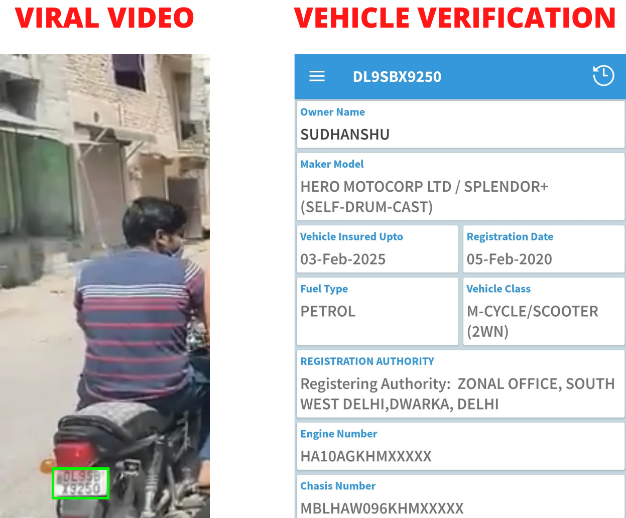 Alt News did a keyframe analysis of the video and spotted the number plate of a bike at the two-second mark. We looked up DL 9S BX 9250 on the national motor registry and found that the vehicle’s registration is from New Delhi.