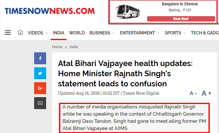 Times Now published another article on “Vajpayee’s health” at around 4 PM without providing any clarification for its earlier slight. Furthermore, the article’s strapline ironically mentioned that “a number of media organisations misquoted Rajnath Singh while he was speaking in the context of Chhattisgarh Governor Balramji Dass Tandon.” But the media outlet missed adding that it made the error as well.