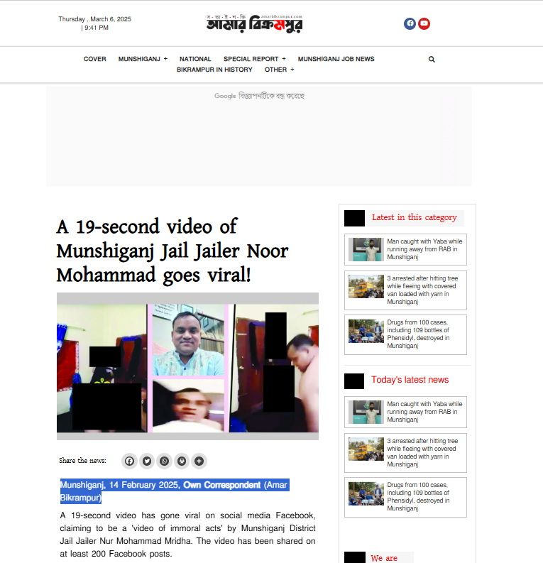 To verify the viral clip, we broke it down into several key frames and ran these through a reverse-image search. This led us to a report titled, “A 19-second video of Munshiganj Jail Jailer Noor Mohammad goes viral!” on a Bangladesh-based portal. The report has several screenshots from the viral clip. The report identifies the man in the viral video as Noor Mohammad Mridha, a jailer in Munshiganj District in Bangladesh. The report says that Mridha was caught having an illicit relationship with someone’s wife.