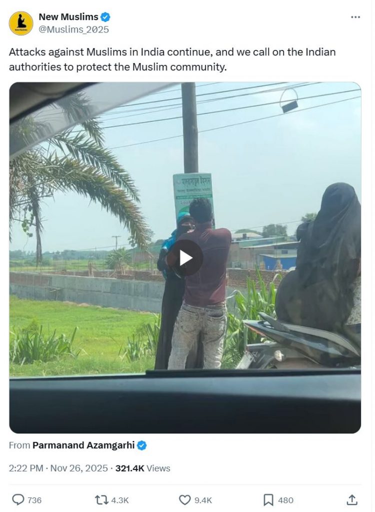 X user New Muslims (@Muslims_2025) posted this clip on November 26 and mentioned in the caption: “Attacks against Muslims in India continue, and we call on the Indian authorities to protect the Muslim community”. At the time of this report being written, the post has received over 363,000 views and has been reposted over 4,800 times. (Archive)