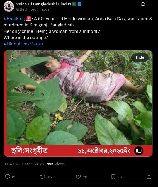 X user Voice of Bangladeshi Hindus (@BeUnitedHindus) shared this image on X, claiming that the woman, named Anna Bala Das, was brutally raped and murdered in Sirajganj, Bangladesh, for her ‘crime’ of being from the minority community. (Archive)