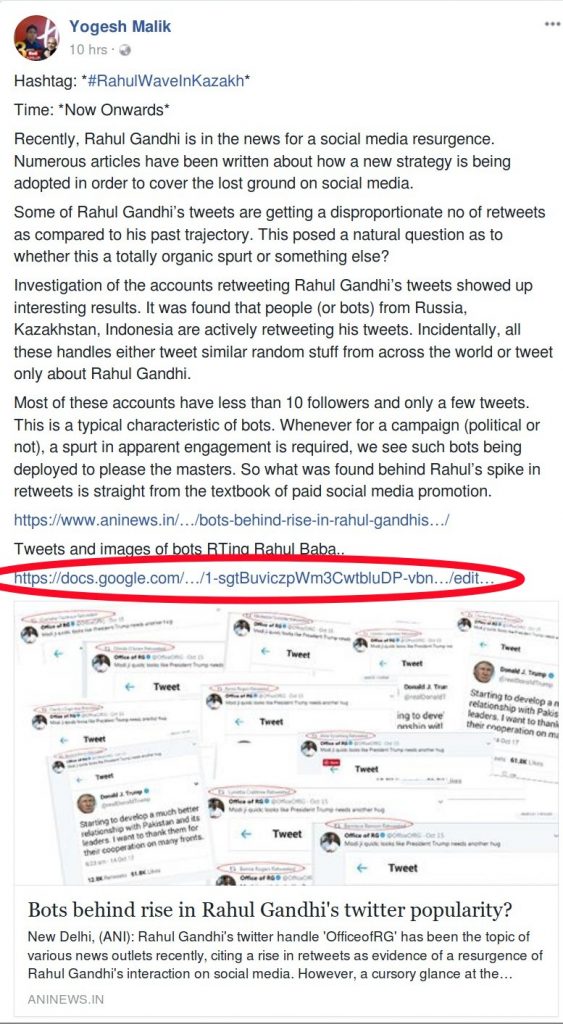 The Google doc has screenshots of each one of the 10 accounts that ANI ‘exposed’ and for every screenshot, the timestamp in the document circulated by BJP IT Cell is many hours before ANI article. Did BJP IT Cell have prior knowledge of the contents of ANI’s article?