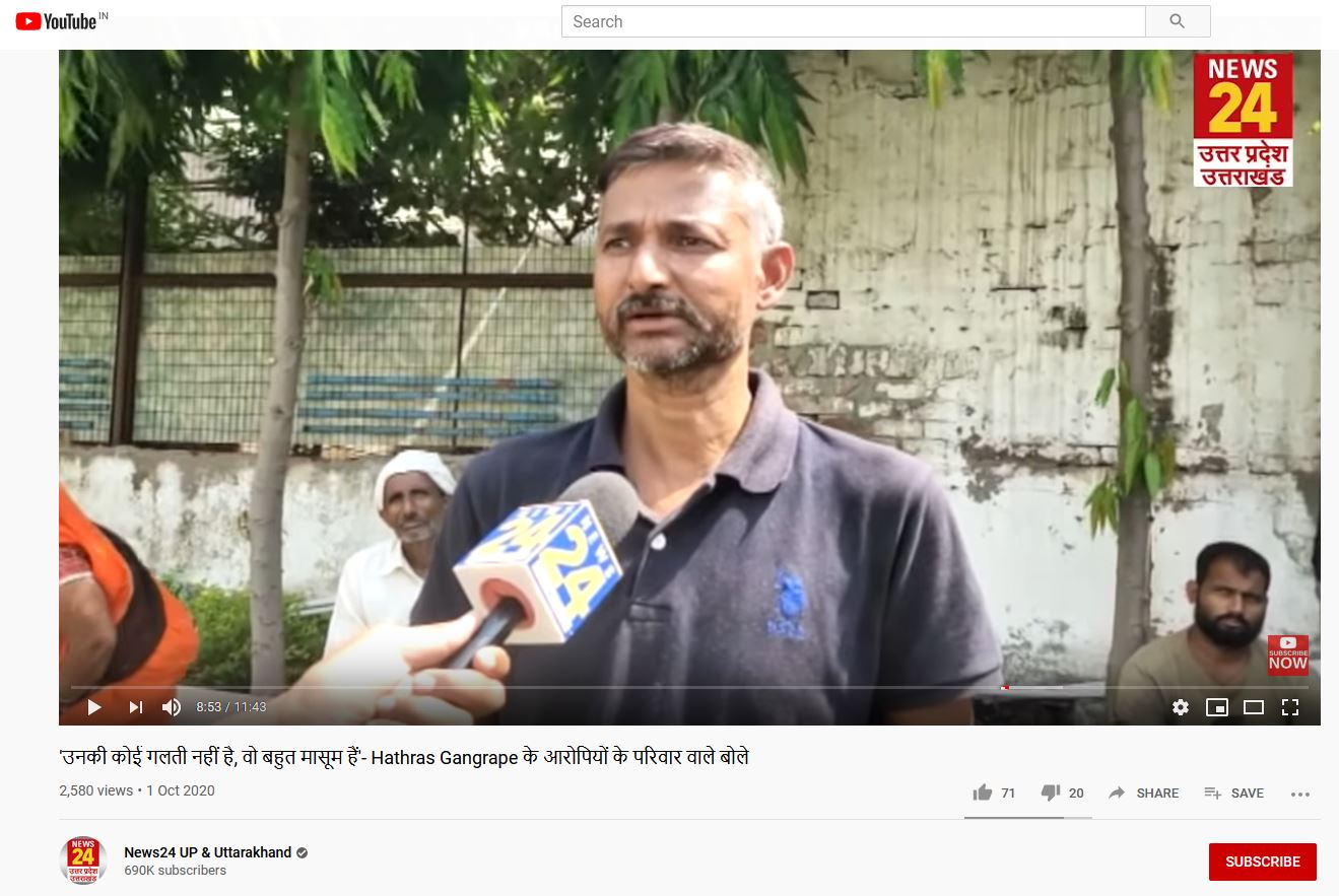 Alt News performed a keyword search on YouTube and found a report by channel News24 UP and Uttrakhand where the family of the accused in the Hathras case are being interviewed. At 8:33 mark, the reporter asked, “You are Sandip’s father. Sandip the one whose name was first taken…” This establishes that Sandip’s father and the man in the viral images, BJP leader Dr Shyam Prakash Dwivedi, are not the same person.