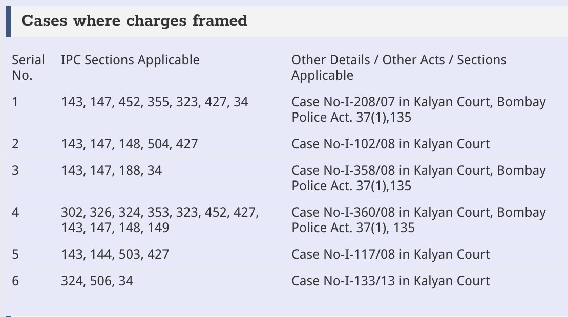 BJP’s Deputy Mayor from Kalyan, Moreshwar Shreeram Bhoir, who is is also the BJYM President of Kalyan District, KDMC BJP Corporator (Ward 107,Pisavli) and Ex-Sarpanch (Pisavli) has as many as 34 cases framed against him in various crimes under different sections according to official data. There are 6 cases where charges have been framed and the matter is under investigation. These cases include some serious charges like murder (IPC 302), house trespass, criminal intimidation, rioting etc.