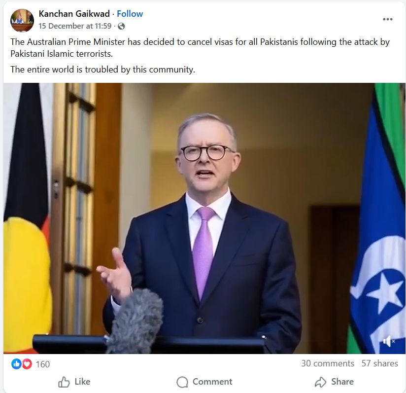 A video depicting a press conference by Australian Prime Minister Anthony Albanese is viral in which he apparently announces the cancellation of all Pakistani visas following the terror attack at Bondi Beach.