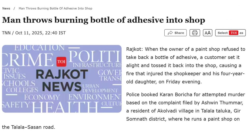 According to the report, Ashwin Thummar, a resident of Akolvadi village in Talala taluka in Gir Somnath district of Gujarat, had filed a complaint of attempted murder against an individual named Karan Boricha, for setting fire to a bottle of inflammable adhesive liquid and throwing it inside his paint shop on the Talala-Sasan Road, which caused injuries to his 4-year-old daughter.