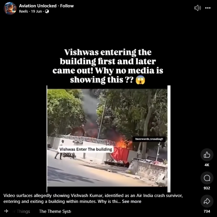 Social media users have widely circulated the video questioning why he walked towards the site of the crash and emerged afterwards. Wondering what unfolded, many insinuated it was fishy that a man “shown as a survivor” was walking into the accident and coming out later. Some even said that this was the “reality” that was not being broadcast by media outlets. Below are some claims from X and Instagram. (Archives 1, 2)