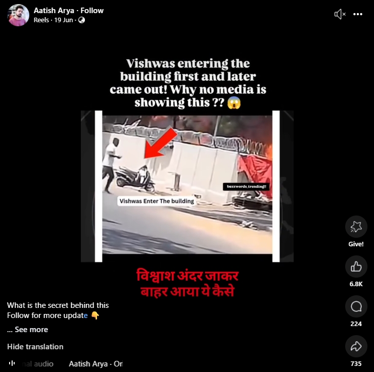 Thus, we were able to conclude that Vishwas Kumar Ramesh emerged from the crash site and tried going back near the burning wreckage at least twice to look for his brother. Piecemeal footage on social media from different angles and at different times has led to confusion regarding the chain of events. Alt News was unable to find footage that shows him walking away from the crash site the very first time. But we were able to establish that the now-viral video shows him trying to re-enter the first time, most likely to look for and save his brother.