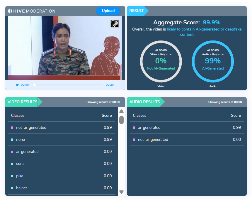 Based on these findings, we believe that the viral video of Colonel Sofia Qureshi bashing the ‘Trishul Exercises’ as a political gimmick and talking about the ‘saffronisation’ of the Indian Army is not genuine and was likely generated using AI technology.
