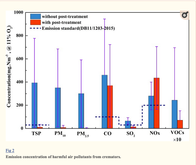 ‘Emission characteristics of harmful air pollutants from cremators in Beijing, China,’ a journal published in May 2018 by National Center for Biotechnology Information studies states, “The process of corpse cremation generates numerous harmful air pollutants, including particulate matter (PM), sulfur dioxide (SO2), nitrogen oxides (NOx), volatile organic compounds (VOCs), and heavy metals.” The emission concentrations are affected by various factors such as “fuel type, cremator type, flue gas post-treatment system and operational maintenance.” The journal provides an infographic that compares the levels of particulate matter and gaseous pollutants emitted with/ without post-treatment.