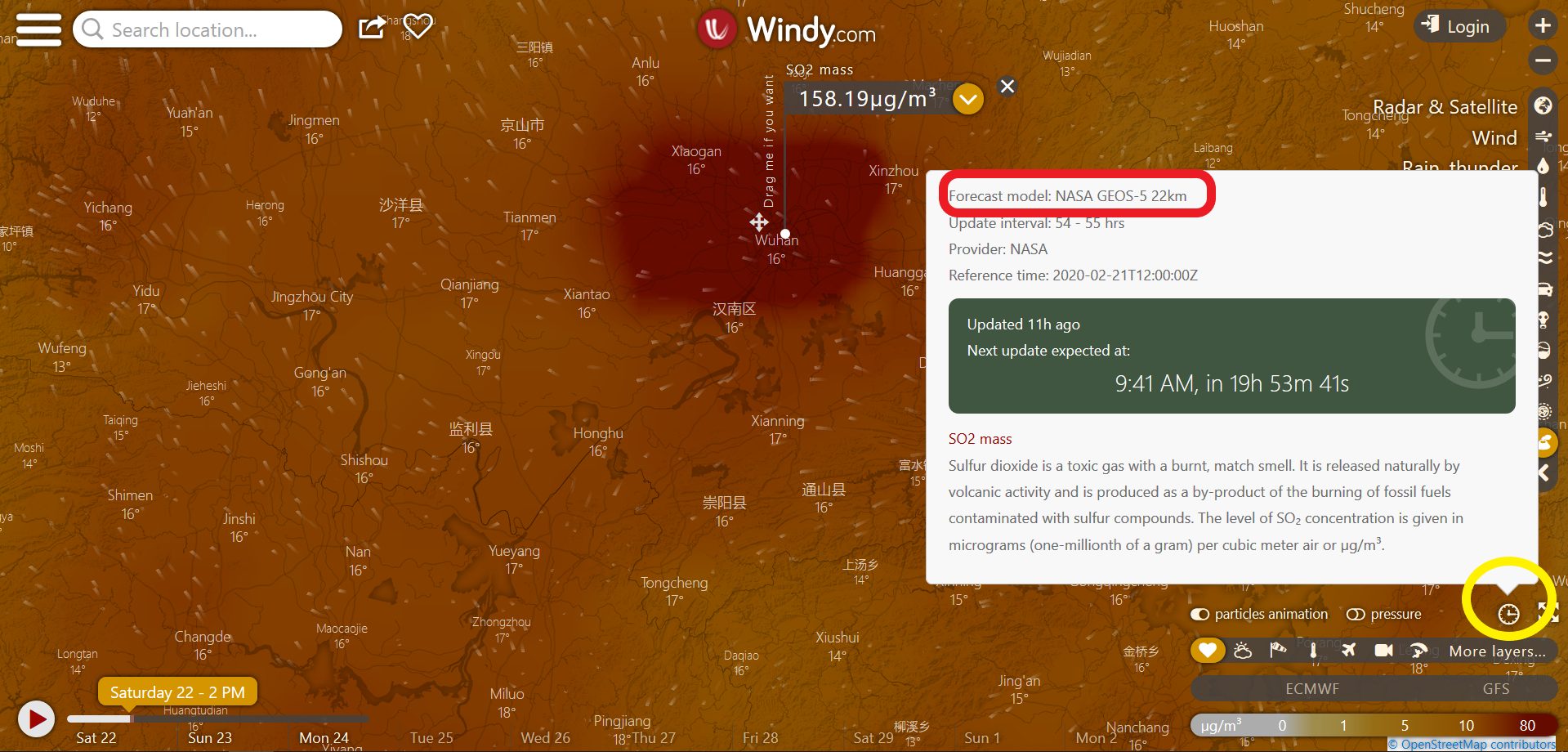 While responding to queries on Windy’s ‘general discussion’ page, Korina Karamalaki, community manager at Windy responded, “windy.com gets the SO2 mass data from NASA model GEOS-5, but we don’t display archive data. There is an explanation of data right in the layer.” The screenshot below shows the Windy homepage – the button highlighted in yellow gives information about data displayed. The section highlighted in red shows that the data is indeed sourced from NASA.