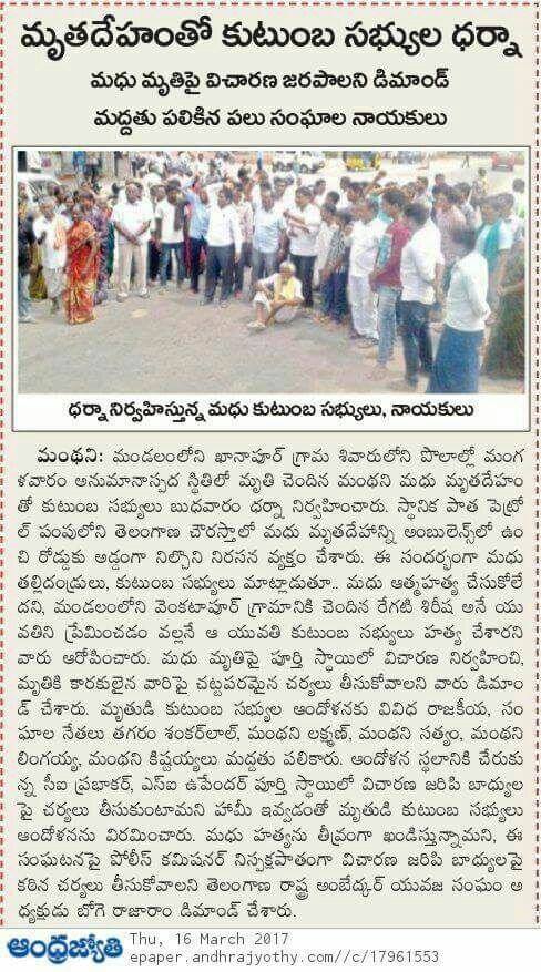 According to a clipping from Andhra Jyothy newspaper dated 16th March 2017, the family of the victim protested out in the open with the victim’s body in the ambulance. The family insisted that it is not a suicide and demanded a thorough enquiry into the issue. According to this report, the local inspectors assured the family that a thorough enquiry will be done.