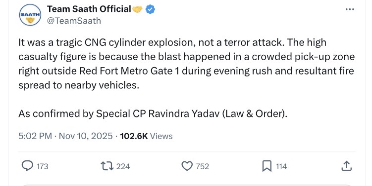 A post by X page @TeamSaath on November 10 said that it was a “tragic CNG cylinder explosion” and attributed the information to special commissioner of police (law & order) Ravindra Singh Yadav. “The high casualty figure is because the blast happened in a crowded pick-up zone right outside Red Fort Metro Gate 1 during evening rush and resultant fire spread to nearby vehicles. As confirmed by Special CP Ravindra Yadav (Law & Order),” the post read.