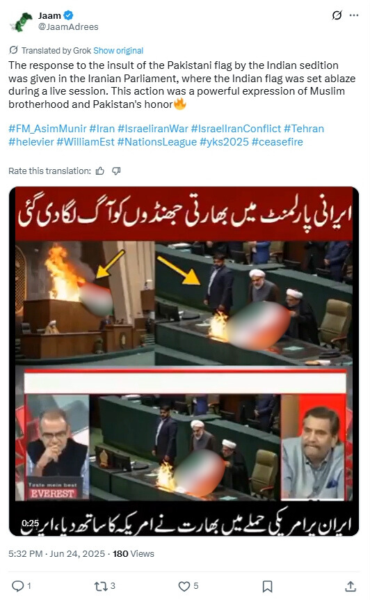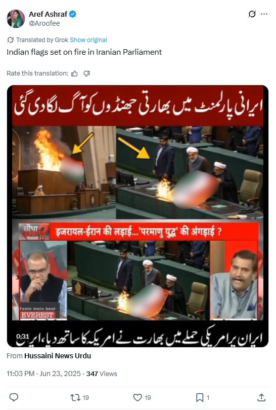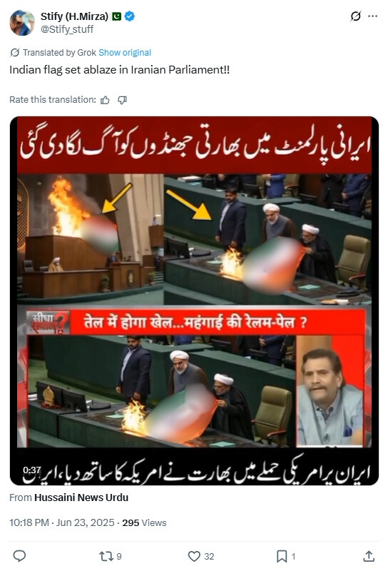 X user @haidar5s posted the viral clip, alleging that the Indian flag had been burnt in the Iranian Parliament. When this article was written, the post had managed to accumulate more than 300,000 views and was reshared over 2,500 times. (Archive)