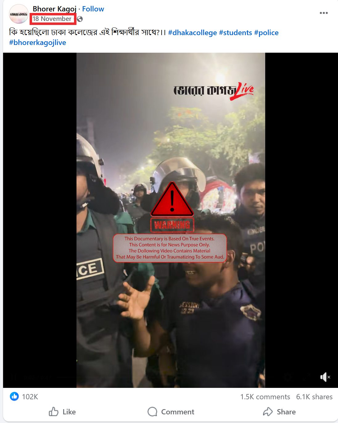 The post by Bhorer Kagoj carried a caption in Bengali which said, “What happened to this Dhaka College student”? In the video, the police ask the man, “Why have you come here”? The man replies that he had come to the market. Next, the distraught youth is seen speaking on the phone with someone and telling them that he was being beaten up by the police and that a senior officer had saved him. Another man, seemingly a friend of the man who was being apprehended, appears towards the end of the video. He is heard mentioning that they had just come from the campus — which again goes on to indicate that they are students of Dhaka College.