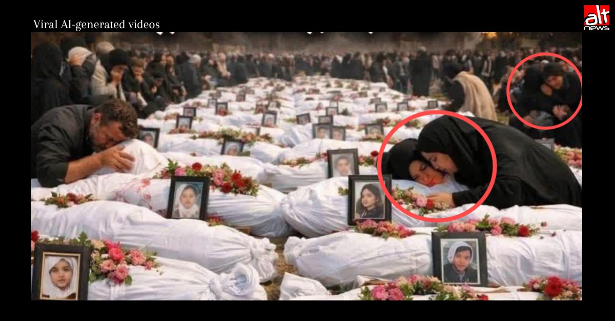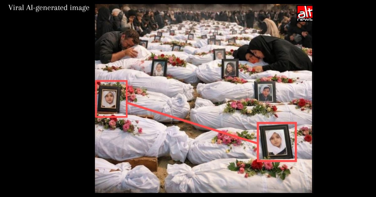 First, two of the photo frames visible in the image that are placed over two different shrouded bodies have the same girl’s picture. This is an anomaly that strongly suggests that the image is synthetically generated.