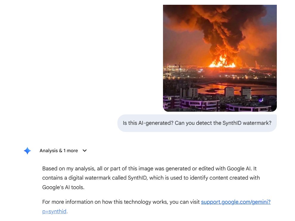 To confirm, we processed the image through Google Gemini, which identified that it was either generated or edited using Google AI. The image contains a digital watermark called SynthID, which is used to identify content created with Google’s AI tools.