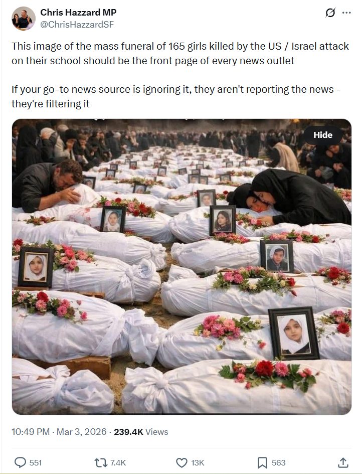 Chris Hazzard, a Sinn Féin MP from the UK, shared the image on X, suggesting in his caption that it depicted the funeral of the 165 girls killed by US/Israel.