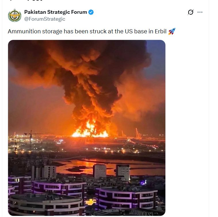 Another account, Pakistan Strategic Forum (@ForumStrategic), also shared the image, claiming that the ammunition storage was struck at the US base in Ebril.