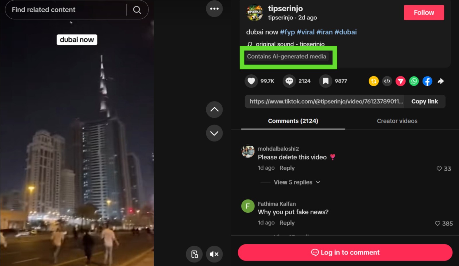 A reverse image search led us to the original TikTok post by a user named tipserinjo from March 2, 2026. The video explicitly included a disclaimer stating that it contains AI-generated media.