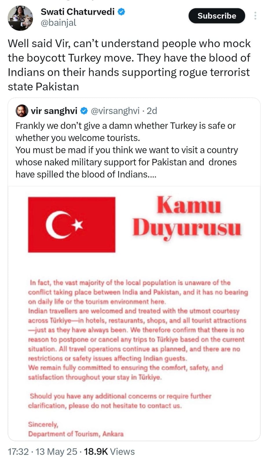 Journalists Vir Sanghvi (@virsanghvi) and Rohini Singh (@rohini_sgh) also posted the same notice emphasising that it would be irrational to expect Indians to visit a nation that openly offers military support to Pakistan. Sanghvi’s post had garnered over a million views. (Archives 1, 2)