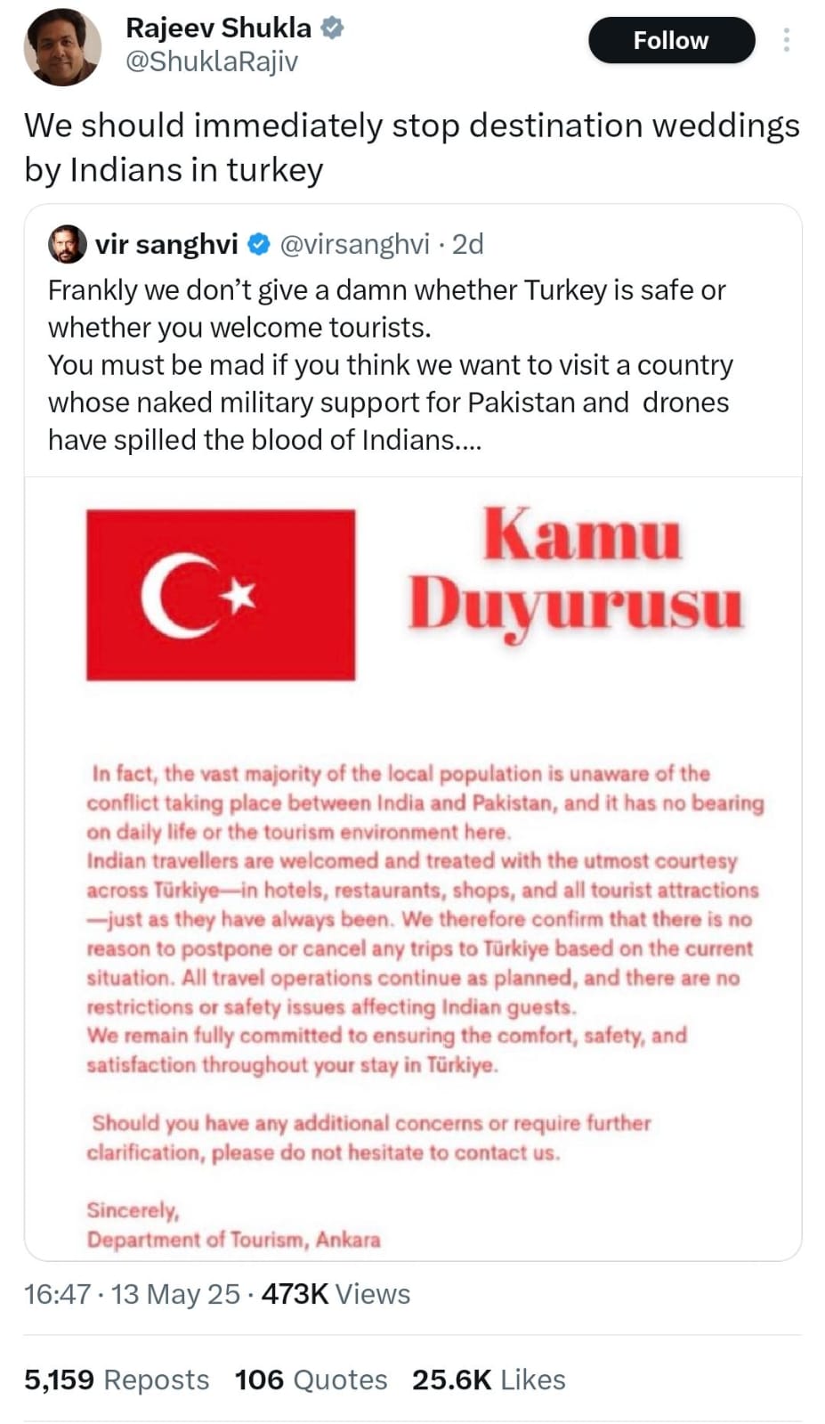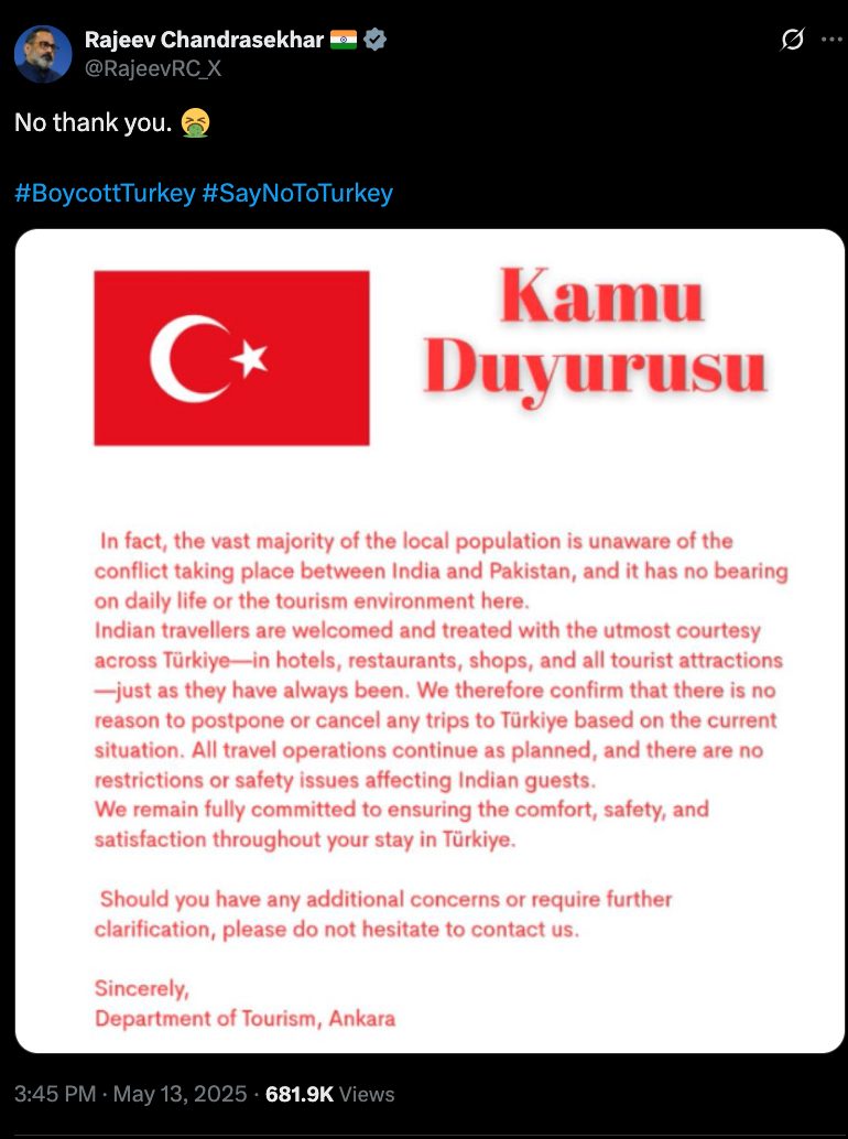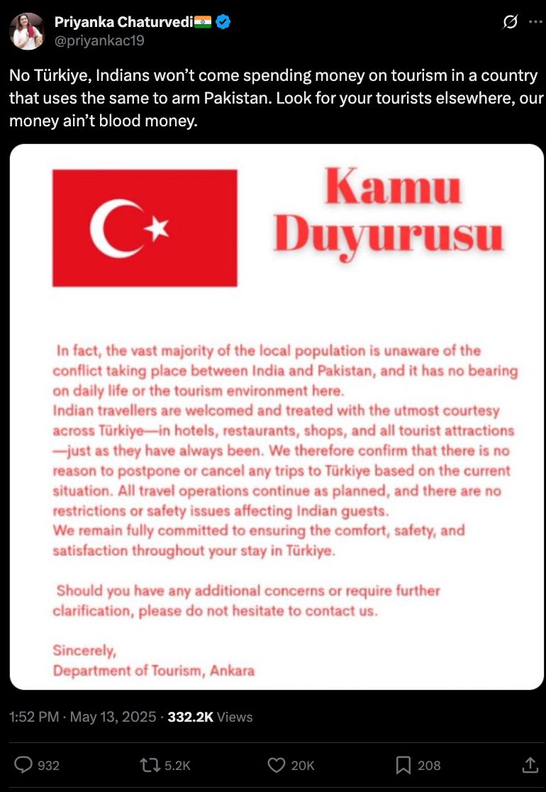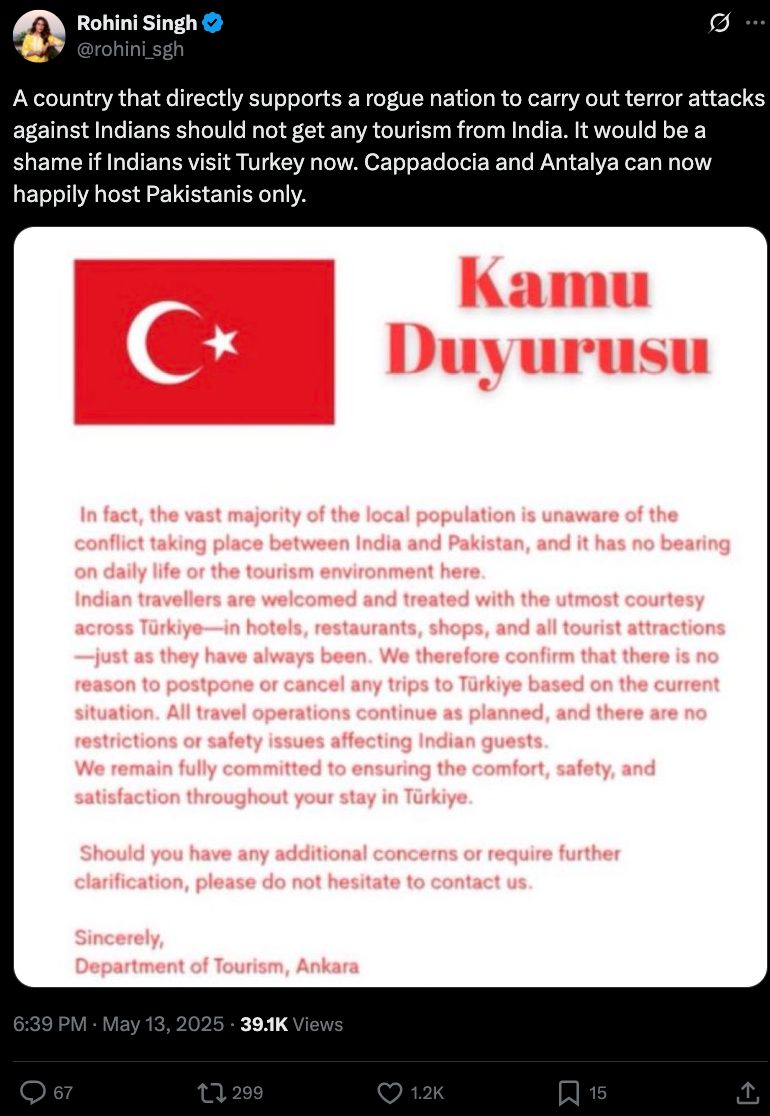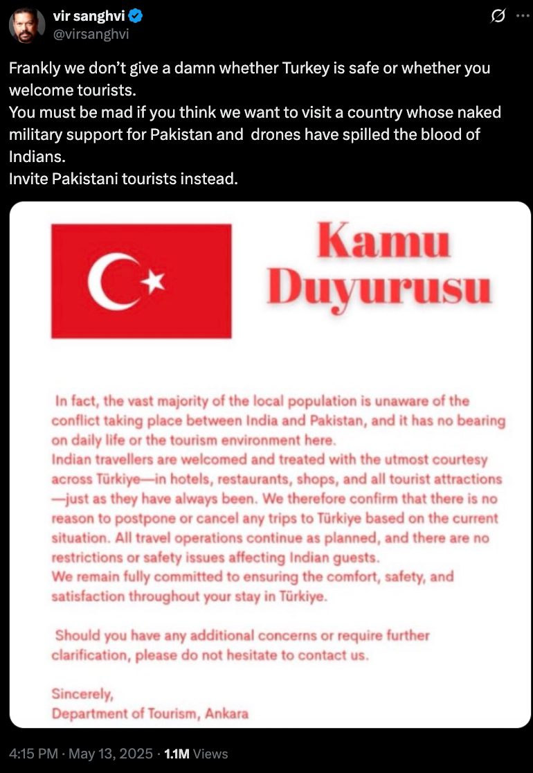 A ‘public announcement’ allegedly issued by Turkey’s ‘department of tourism’ urging Indian travellers not to cancel trips to the country has gone viral on social media. The letter, bearing the Turkish flag and the words “Kamu Duyurusu” (public notice or announcement), says that a “vast majority of the local population is unaware of the conflict taking place between India and Pakistan” and thus there is “no reason to postpone or cancel any trips to Türkiye.” It adds that “there are no restrictions or safety issues affecting Indian guests.”