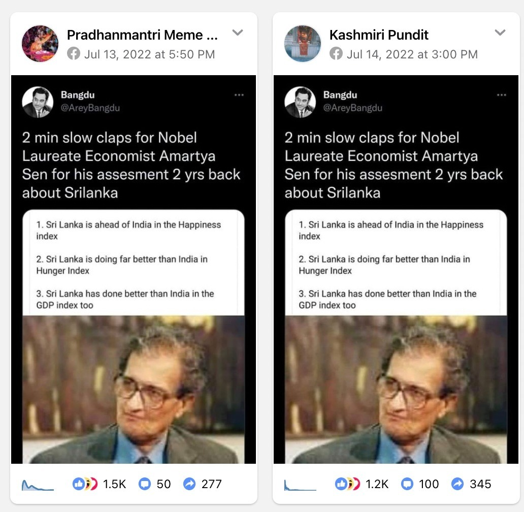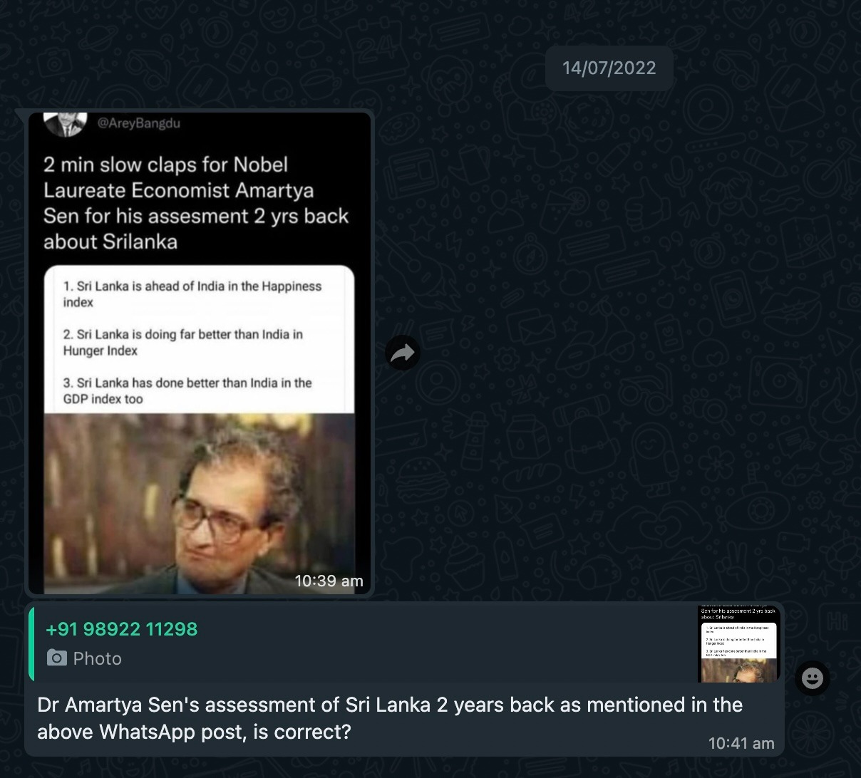 In the backdrop of the ongoing economic crisis in Sri Lanka, several social media users have shared an image of Nobel laureate Dr Amartya Sen along with the following statements: “Sri Lanka is ahead of India in Happiness Index, Sri Lanka is doing far better than India in Hunger Index, Sri Lanka has done better than India in GDP Index too.” Due to the nature of the graphic, viewers can misinterpret these statements as quotes by Sen.
