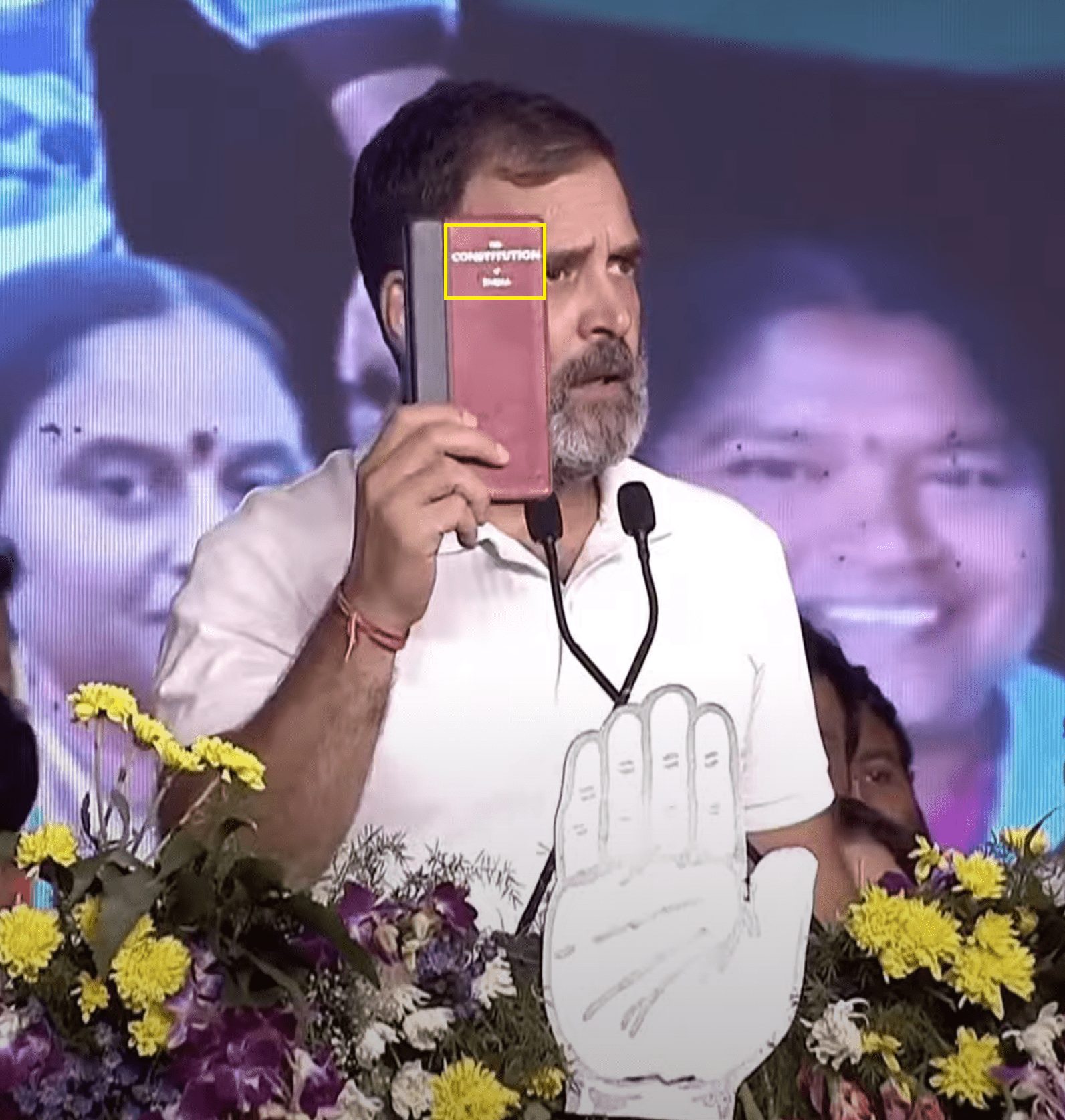 We found the entire 50-minute-long recording of the public meeting on the Indian Express’ YouTube channel, the meeting was held on May 5. In this video, we can find a front angle of the moment at which Rahul Gandhi held up the Constitution to the crowd. At the 29:22 mark of the video, Gandhi can be seen holding up the Constitution. On the cover, one can see “The Constitution of India” clearly written.