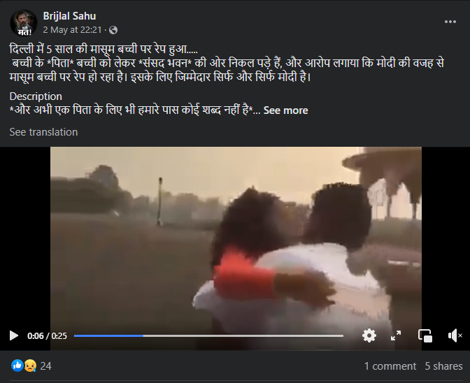 Facebook user Brijlal Sahu, whose bio says ‘Works at Indian National Congress’, shared the video with the following caption in Hindi, which said a 5-year-old girl had been raped in Delhi and the girl’s father protested near the Parliament House with the girl and alleged that Modi was to blame for the rape.