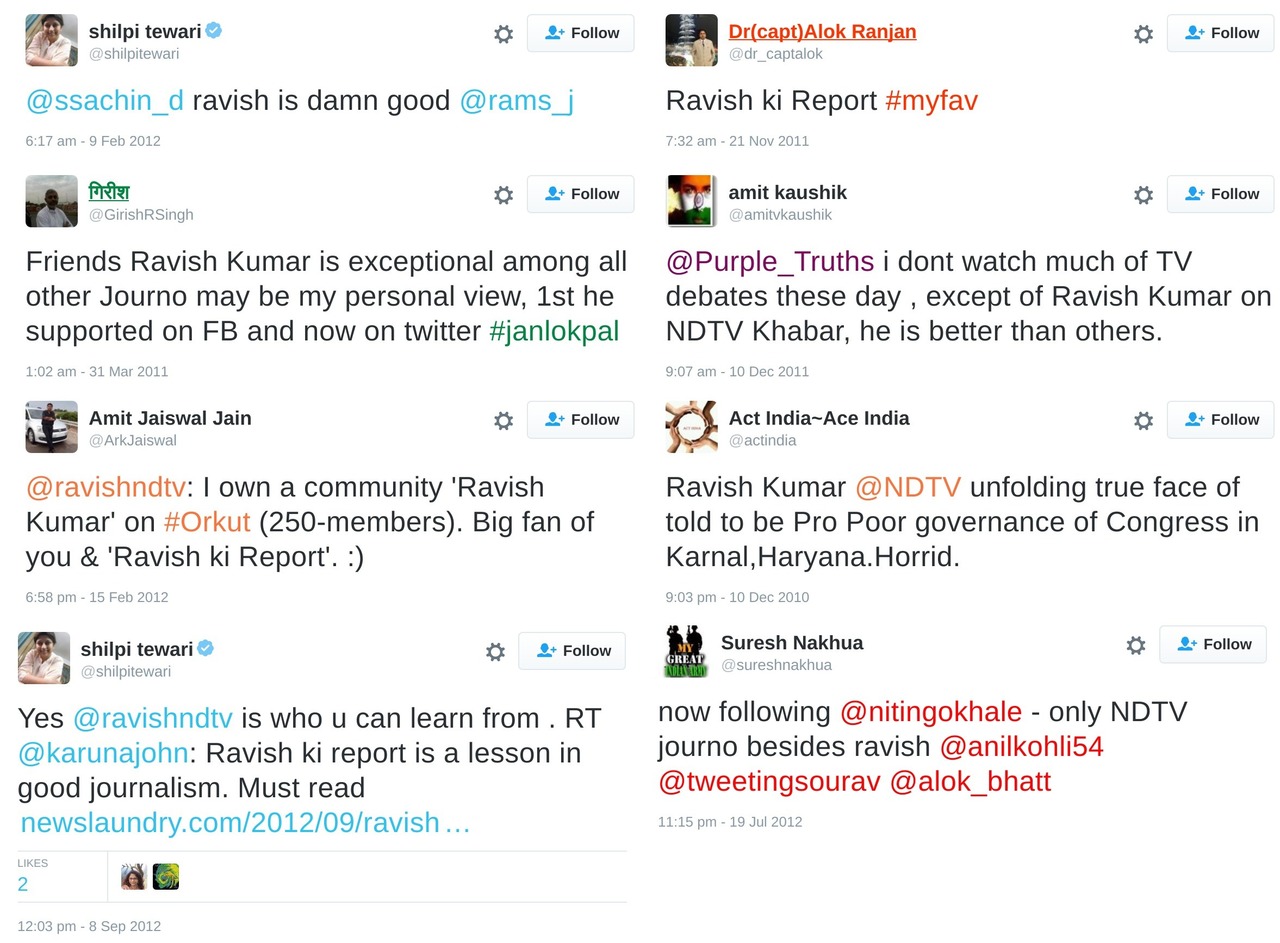 These days, the very name of Ravish Kumar causes much distress to BJP supporters. Ravish’s journalism which constantly questions the establishment, their policies and their actions has resulted in BJP supporters harbouring an immense amount of resentment against him. However, things were not always such. Before 2014, when Ravish used to target the UPA Govt, he was quite a favourite among many Modi supporters. Here’s a sample of their tweets pre-2014 when they used to be effusive in praise for Ravish’s journalism. Each one of the Twitter handles below is followed by PM Modi on Twitter.