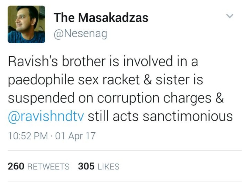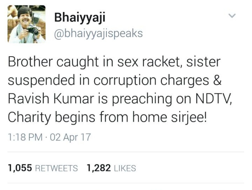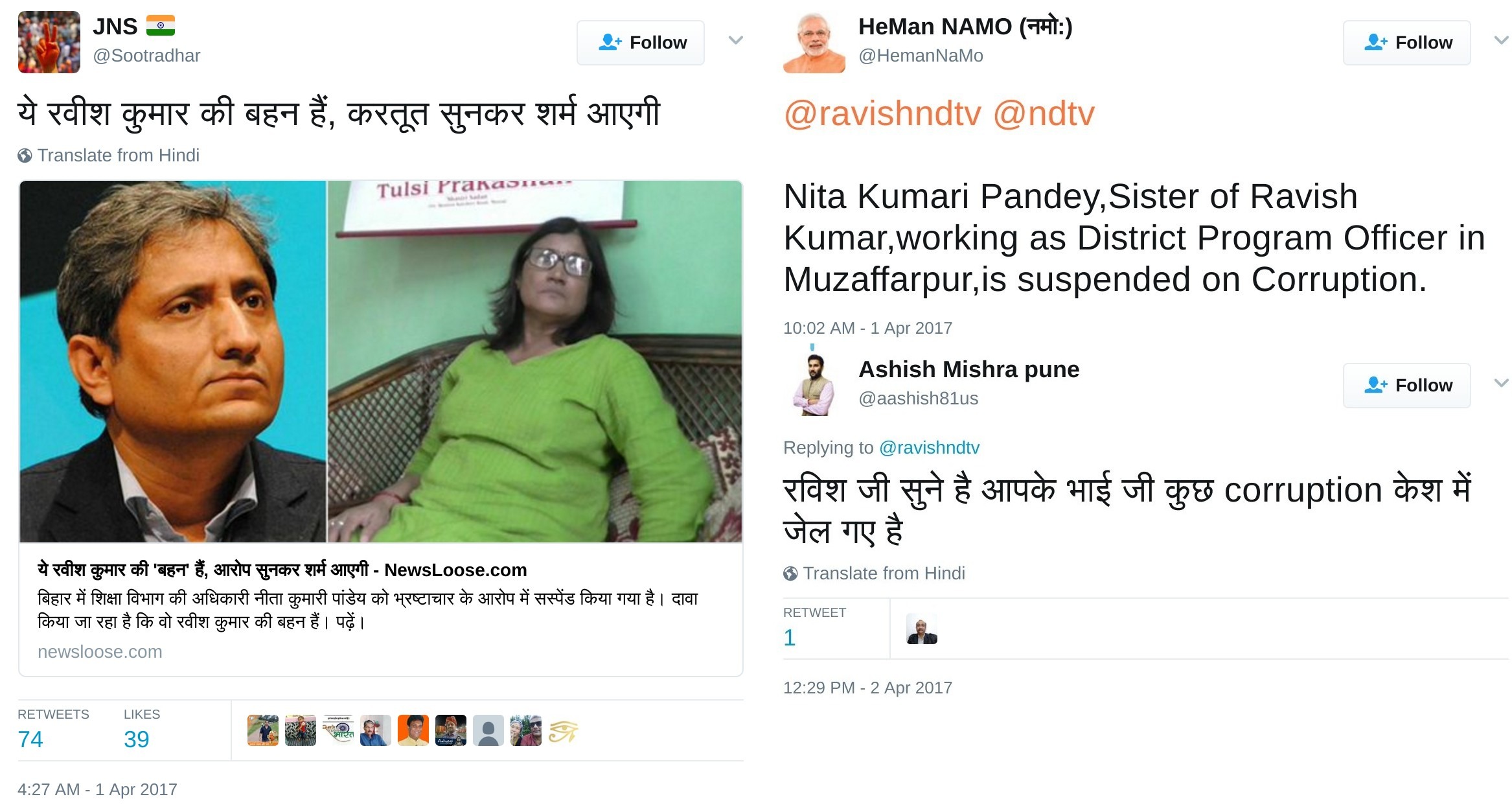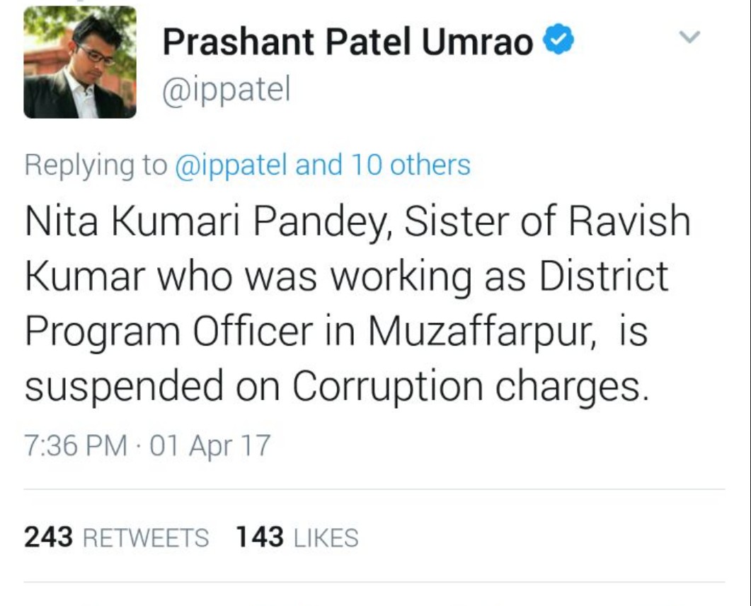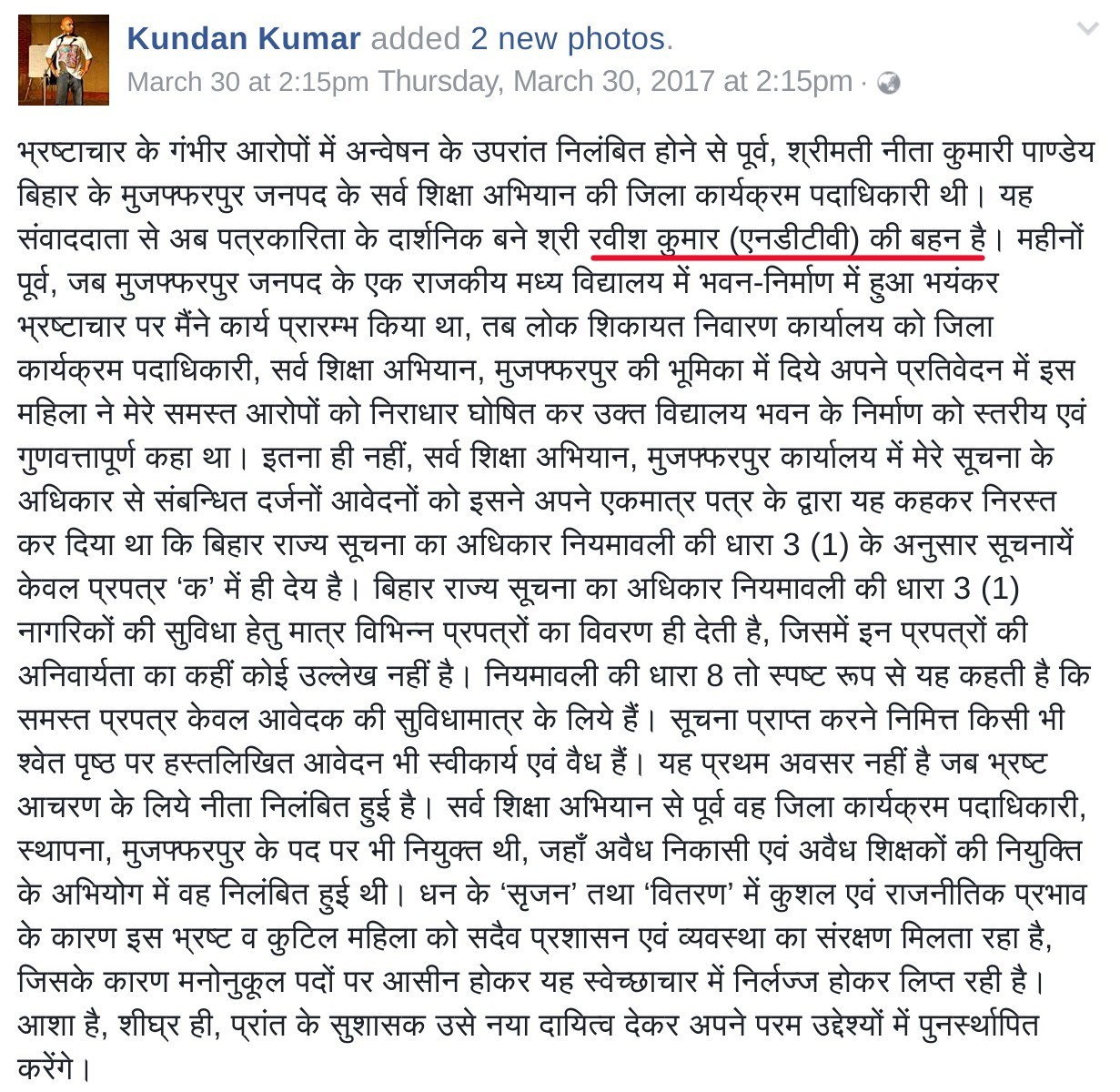Fast forward to 2017, now there’s a full-scale character assassination campaign going on by the Indian right-wing against Ravish Kumar. The latest is an allegation that Ravish Kumar’s sister has been charged with corruption charges and has been suspended from duty. The rumour was started by a person called Kundan Kumar via his Facebook profile in which he claims that one Shrimati Nita Kumari Pandey has been suspended from a Government school in Muzaffarpur, Bihar, due to corruption charges. Kundan Kumar also states that Nita Kumari Pandey is Ravish Kumar’s sister.