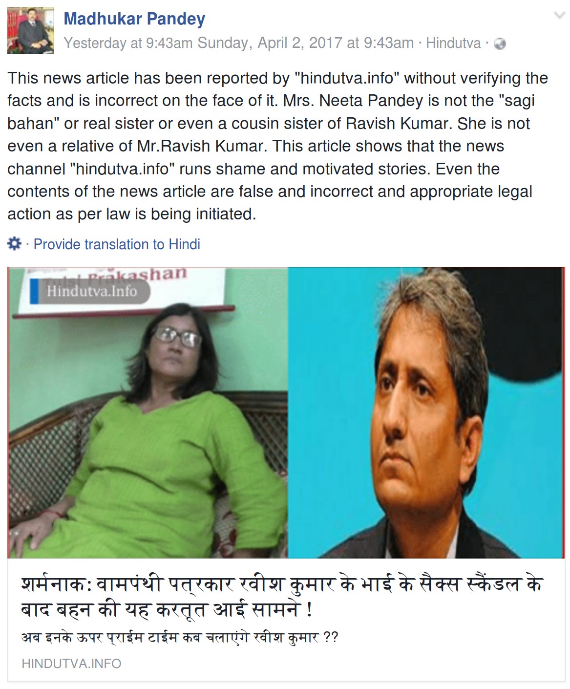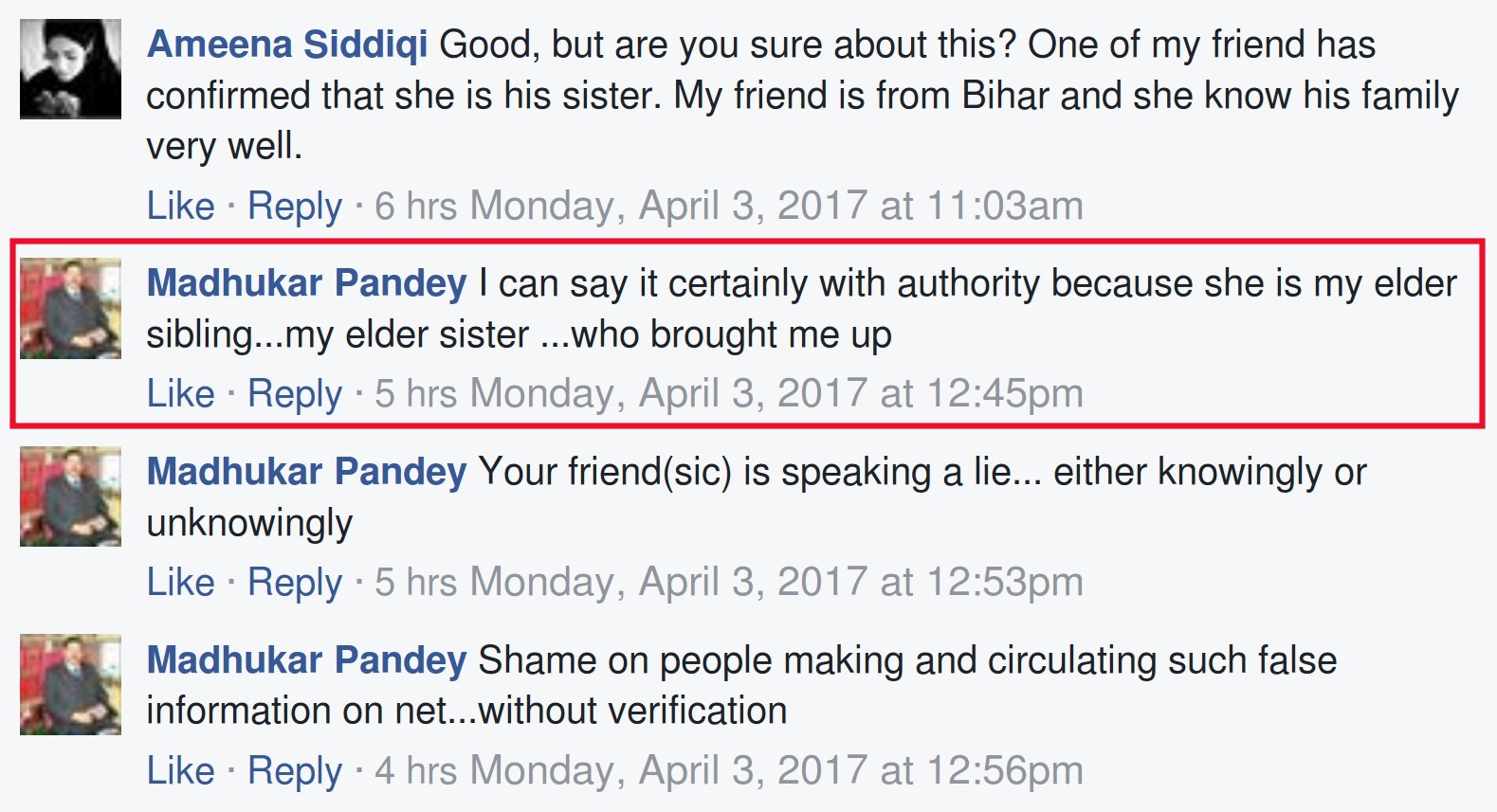 We contacted Mr Madhukar Pandey over the phone and he confirmed the contents of his Facebook post and reiterated that Nita Kumari Pandey is not related to Ravish Kumar in any way and is actually his elder sister. Thus lies demolished yet another lie propagated by the right-wing ecosystem in India.