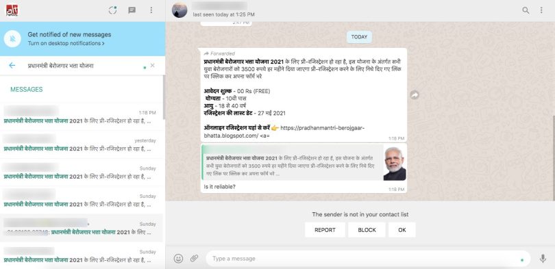 A viral claim circulating on social media and messaging application WhatsApp suggests that unemployed youth will be given a monthly sum of Rs 3,500 under the Pradhan Mantri Berozgari Bhatta Yojna (Unemployment Allowance Scheme) 2021. The message includes a pre-registration link for those wishing to sign up.