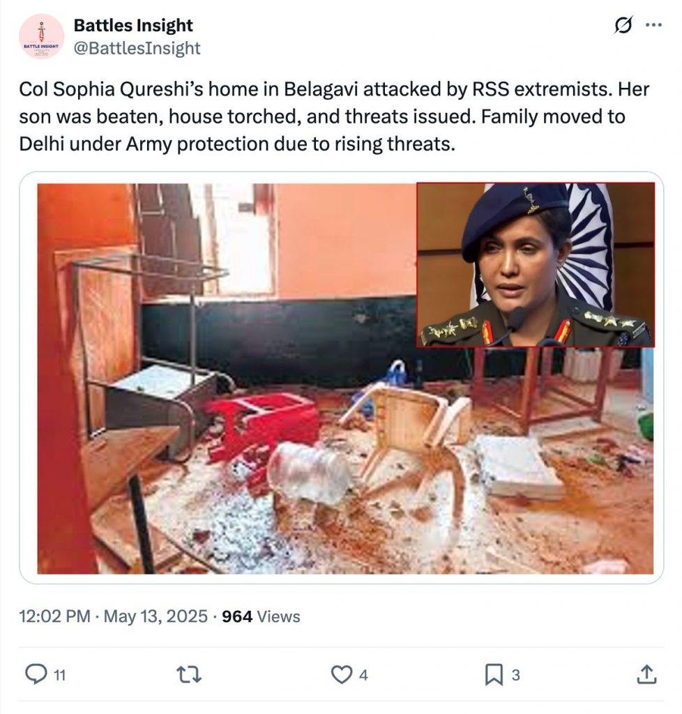 After the recent India-Pakistan conflict, an image of a vandalised home was shared on social media alongside a picture of Colonel Sofia Qureshi. Those sharing the image claimed that Colonel Qureshi’s house in Belagavi, Karnataka, was attacked by RSS (Rashtriya Swayamsevak Sangh) goons.