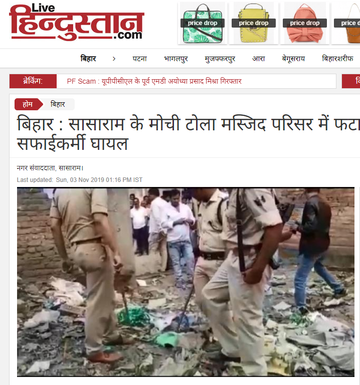 The incident was widely reported in Hindi media. A report by Hindustan said that the mosque was under repair the past one month. The labourers working in the area had collected waste on a compound outside the mosque. As soon as they set the waste on fire, a blast knocked down three labourers and also the boundary wall of the mosque.