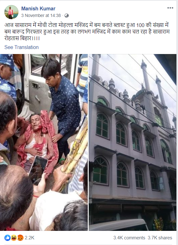 A claim widely circulated on social media about the recent bomb blast in Sasaram, Bihar, asserts that the explosion took place inside a mosque where a hundred other bombs were also recovered. From the Facebook account of one Manish Kumar, the post drew close to 4,000 shares.