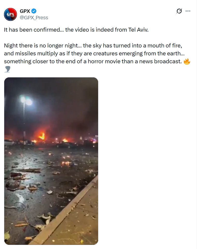 GPX Press, which describes itself as dealing in “Global News & Politics 🌐Unfiltered updates. High-Signal, Zero-Noise”, described the video as “confirmed” footage from Tel Aviv.