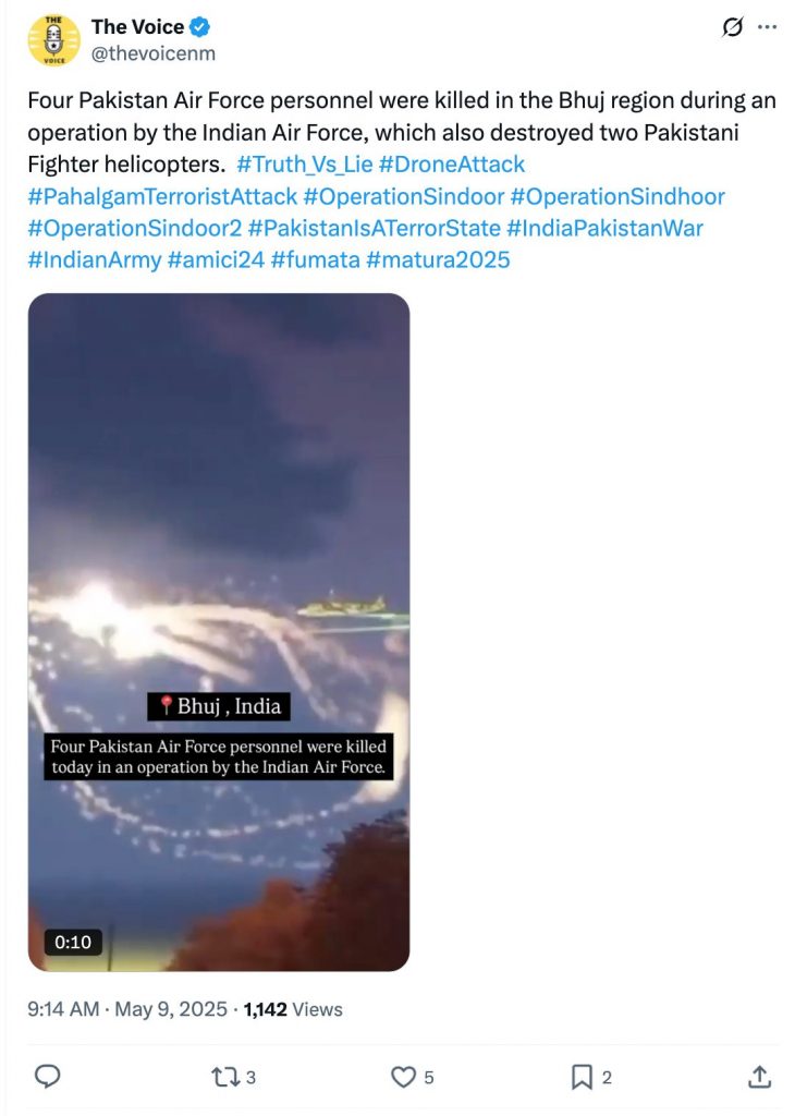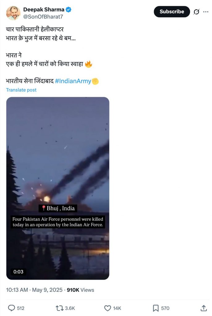 X user Aman Sah (@amnofc) shared the video and wrote, “Four Pakistani Air Force personnel were killed in the Bhuj area during an operation of the Indian Air Force, in which two Pakistani fighter helicopters were also destroyed.” (Archive)