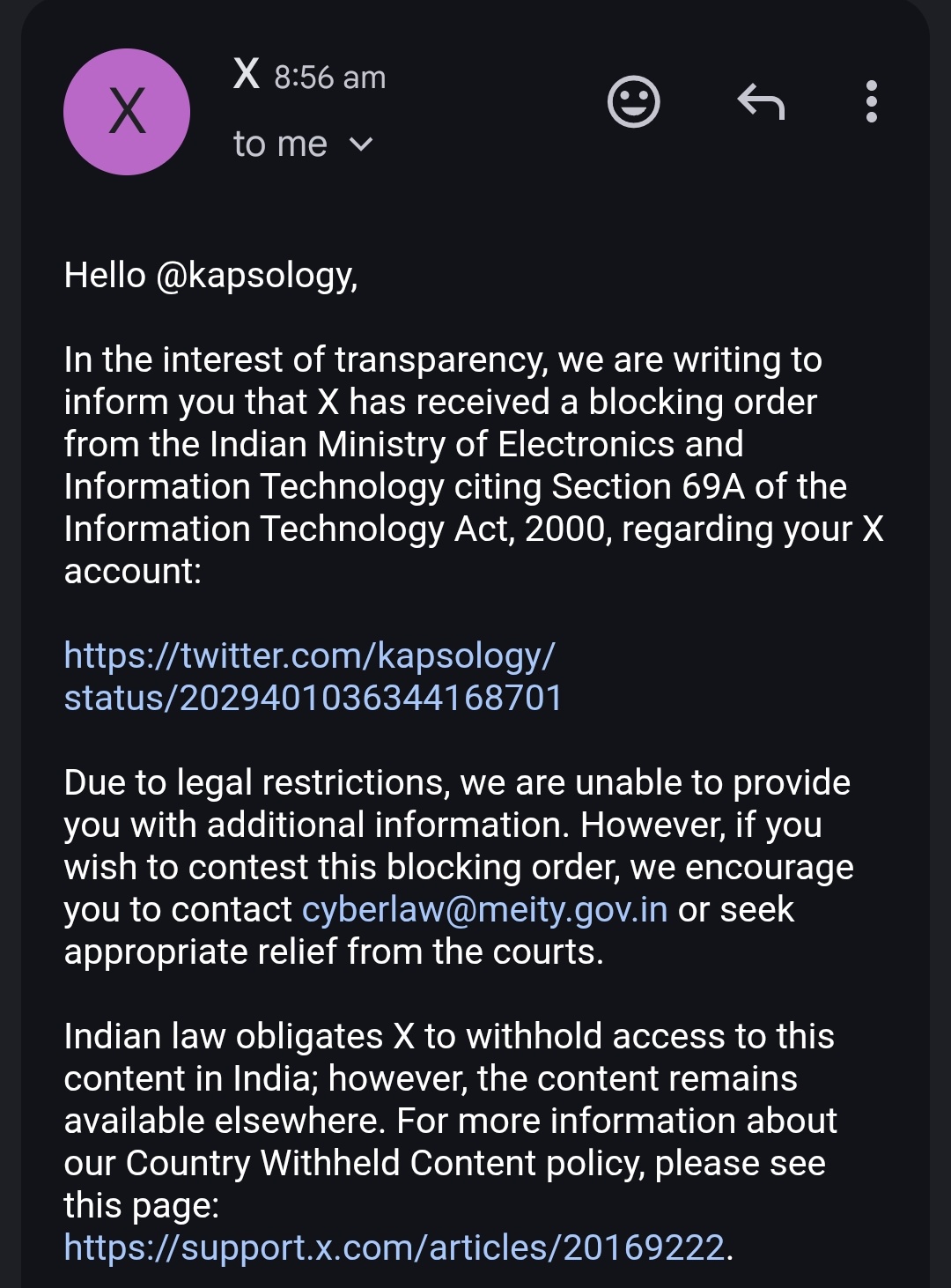 Equally concerning is the opacity surrounding these actions. Blocking orders under Section 69A are confidential, and users often learn of restrictions only through automated emails from platforms like X. There is typically no prior notice, no opportunity for a hearing, and no clear explanation of how a particular post endangers national security—raising serious questions about due process and accountability.